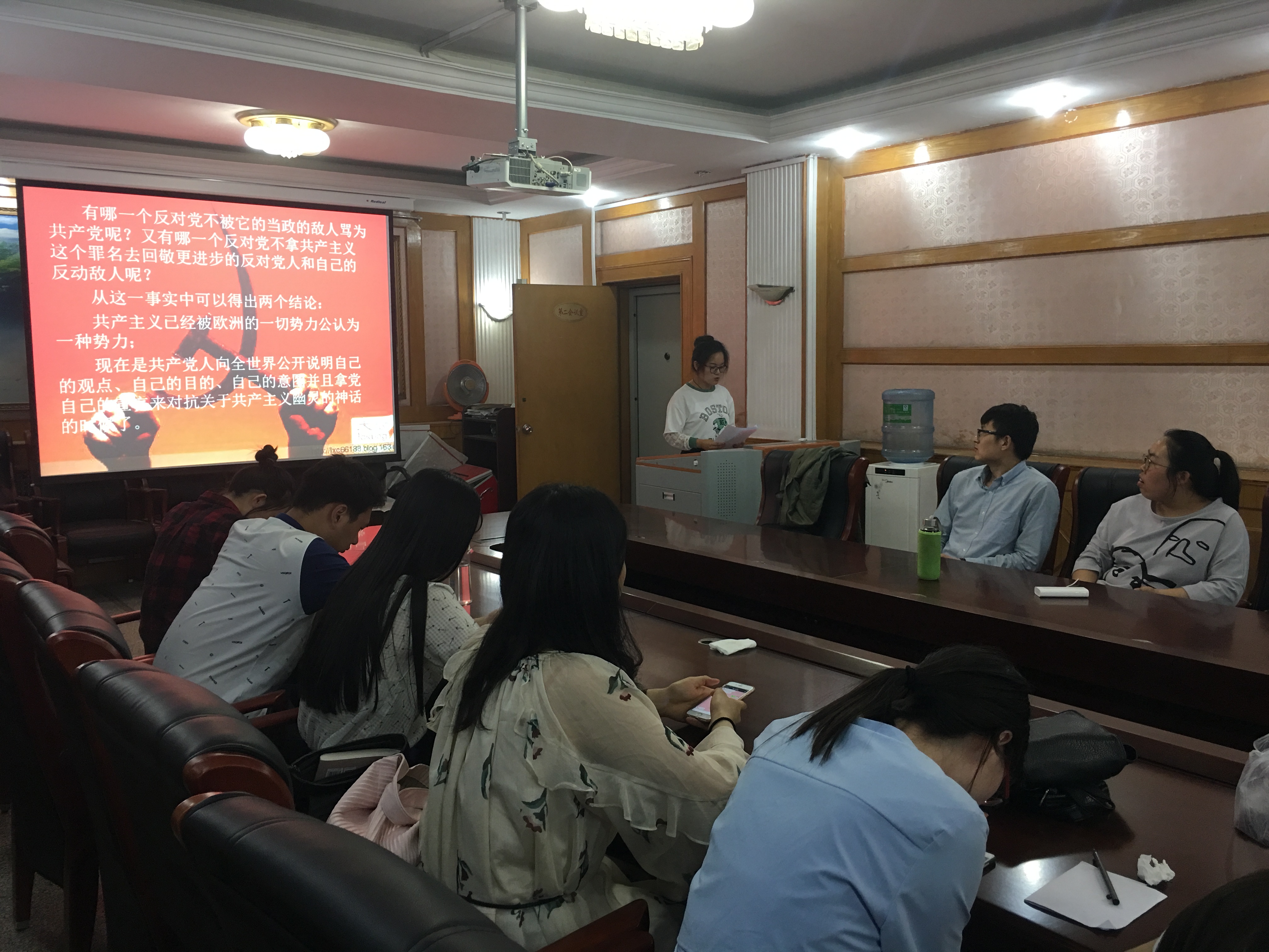 活动共分为两大部分。第一期由研二全体同学的朗读首先开始。一张张精美的演示文稿,一段段流畅的朗读和演讲,整个会场陷入了一种严肃而神圣的氛围中。马恩灵魂的声音在会场中不断地响起,带给大家发自内心的震撼和感动。第二阶段由研一同学的朗读拉开帷幕。同学们别具一格的朗读和展示,不同的段落和不同的理解和感悟,使原本晦涩的文字似乎活跃了起来,飘荡在每一个人的心间。朗读结束后,同学们又做了深入的讨论交流,大家纷纷畅所欲言,分享自己在朗读中的感触和体会。此次活动还邀请了毕业班优秀学生代表、即将升入南开大学读博深造的孙健伟作经验分享。