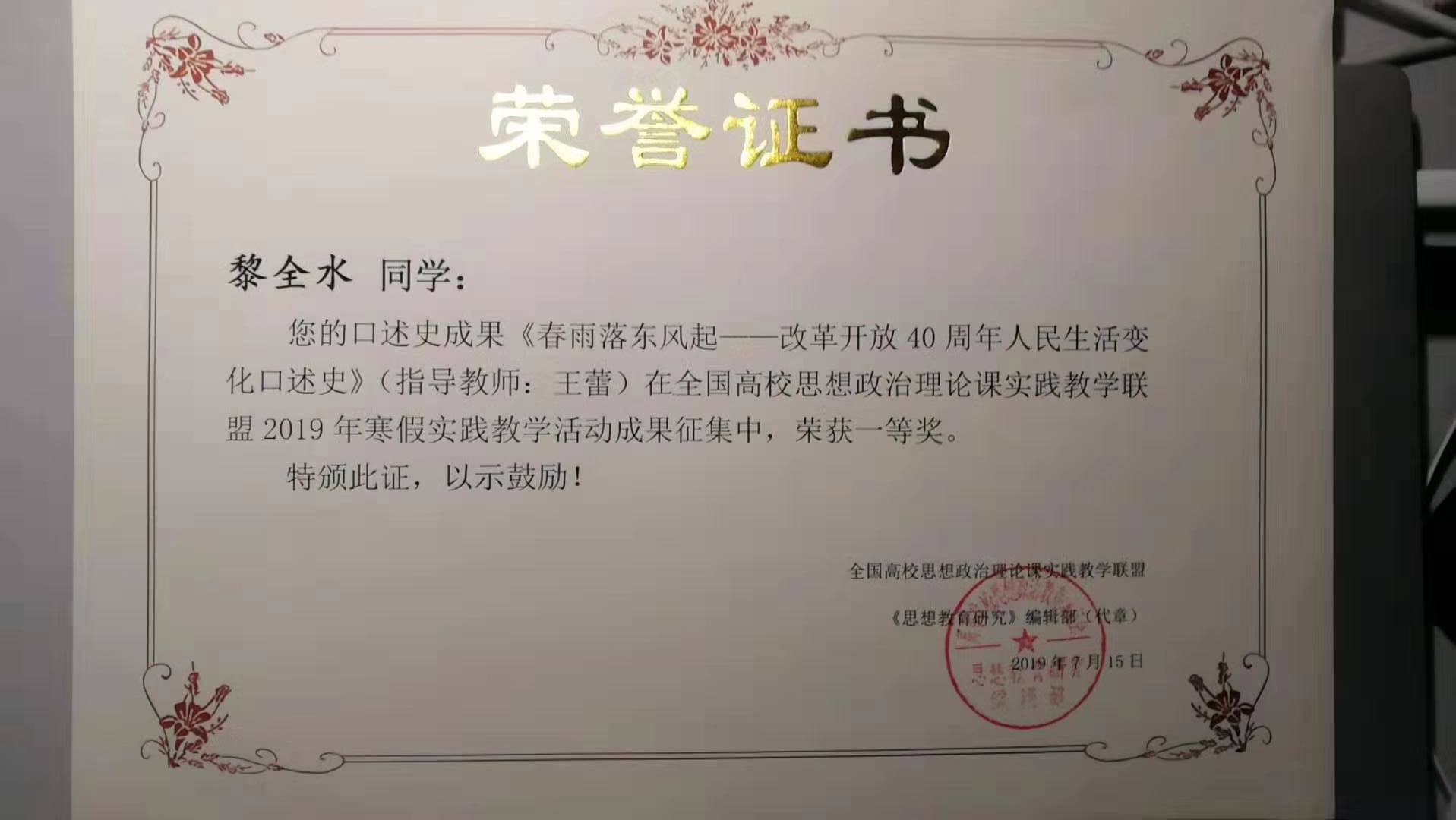 此次活动由全国高校思想政治理论课实践教学联盟主办,《思想教育研究》编辑部、北京科技大学伟德bv1946等单位承办,成果内容和形式分为口述史和微电影两类。本次成果征集活动中,口述史部分共收集到来自全国74所学校报送的作品474件,微电影部分共收集到来自全国47所学校报送的作品94件。由伟德bv1946王蕾老师指导的,法学院法学1704班学生黎全水的口述史作品《春雨落东风起——改革开放40周年人民生活变化口述史》、国际教育与合作学院国际财务1703班学生倪玲的口述史作品《家乡40年家庭联产承包责任制》分获一等奖和二等奖,为我校赢得了荣誉。