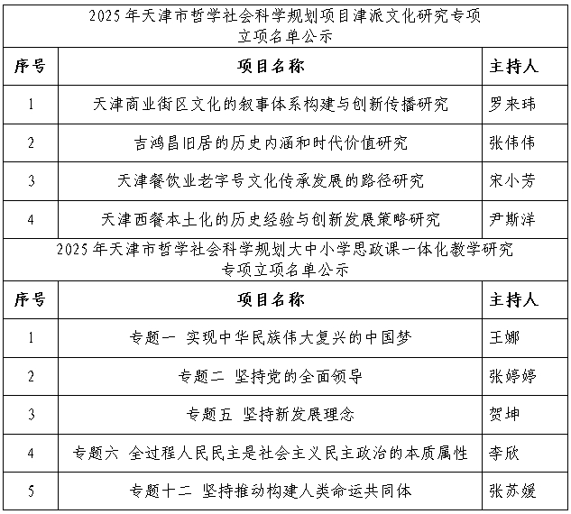 近日,天津市哲学社会科学工作办公室公布了2025年天津市哲学社会科学规划项目公示名单,伟德bv1946获批9项课题,其中大中小学思政课(习近平新时代中国特色社会主义思想课程)一体化教学研究专项5项,为获批数量最多的高校之一;津派文化研究专项4项,展现了学院津派文化的研究成果。