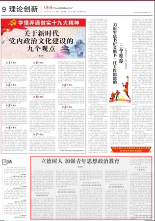 6月11日,《天津日报》(理论版)刊发伟德bv1946陈映霞博士理论文章《立德树人 加强青年思想政治教育》。文章指出,习近平总书记在北京大学师生座谈会上的重要讲话,再次强调了思想政治教育在青年培养中的重要作用,为我国高等教育事业发展和青年学生报效祖国、承担历史使命和时代责任指明了正确方向。文章从青年是实现中华民族伟大复兴的生力军,青年思想政治教育必须坚持马克思主义的指导地位,青年思想政治教育必须以社会主义核心价值观为引领,青年思想政治教育离不开高素质教师队伍,青年既是追梦者也是圆梦人等五个方面,阐述了习近平总书记关于青年思想政治教育系列重要论述的逻辑起点、基本立场、关键核心、重要依托及落脚点,揭示了在中国特色社会主义进入新时代的历史背景下,加强青年思想政治教育,是培养担当民族复兴大任时代新人的必然要求。