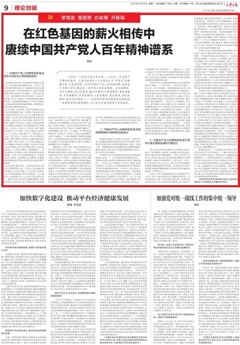 4月19日,《天津日报》(理论创新版)刊发我校伟德bv1946李欣副教授理论文章“在红色基因的薪火相传中赓续中国共产党人百年精神谱系”。文章指出,一个国家一个民族不能没有灵魂,一个政党一刻也离不开精神的滋养。从嘉兴南湖的小小红船成长为“中国号”的巍巍巨轮,红色基因在一代代中国共产党人的顽强拼搏、砥砺奋斗中薪火相传,锻造出一系列伟大的革命精神。从红船精神、井冈山精神,到大庆精神、塞罕坝精神;从雷锋精神、焦裕禄精神,到劳模精神、科学家精神;从抗战精神、奥运精神,到抗疫精神、脱贫攻坚精神……一座座特质鲜明的精神坐标构筑起一条清晰独特的精神谱系,为立党兴党强党提供了丰厚滋养。文章从中国共产党人的精神谱系是诠释百年大党风华正茂的基因密码;中国共产党人的精神谱系是承载民族精神时代精神的实践表达;中国共产党人的精神谱系是引领伟大事业蓬勃发展的不竭动力3个层面进行了阐述。