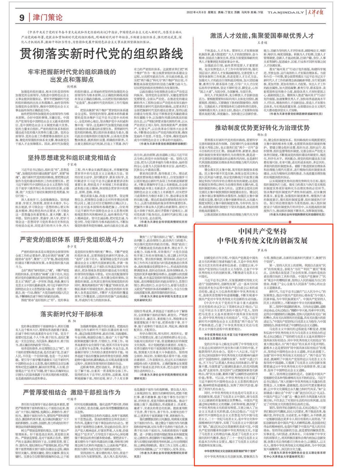 2022年4月8日,《天津日报》刊发我院罗来玮博士理论文章“中国共产党坚持中华优秀传统文化的创新发展”。文章指出,回顾党的百年历程,中国共产党既是中华优秀传统文化积极引领着和践行者,又是中华优秀传统文化忠诚的继承者和弘扬者。自建党以来,中国共产党坚持以马克思主义为指导,立基于中华优秀传统文化的创新发展,不断推进马克思主义中国化。文章从中华优秀传统文化丰富习近平新时代中国特色社会主义思想的内涵、中华优秀传统文化创新发展做到“四个坚持”等两个层面进行了阐述。