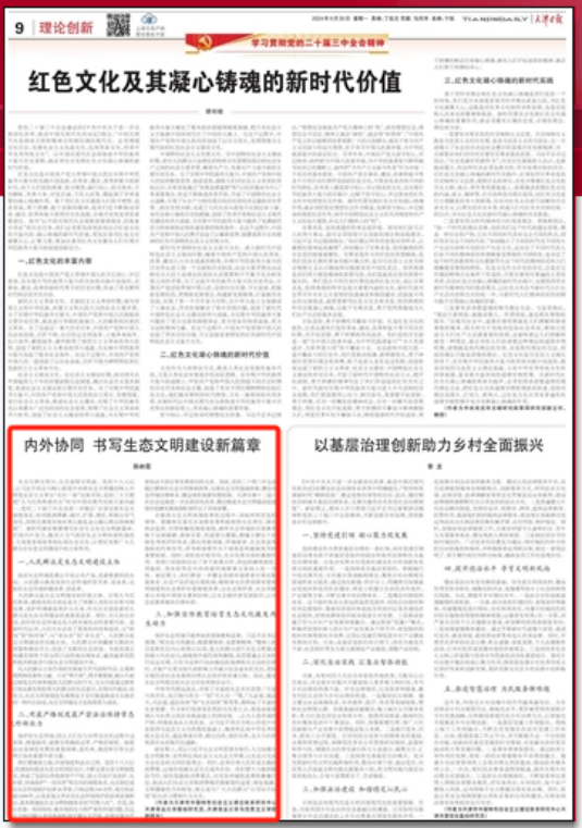 9月30日,《天津日报》(理论创新版)刊发我校伟德bv1946陈映霞副教授理论文章《内外协同书写生态文明建设新篇章》。文章指出,新时代新征程要谱写社会主义生态文明新篇章,我们须内外发力,既花大力气抓好生态文明体制机制改革,又高度重视培育和弘扬生态文化,以更好发挥广大人民群众在生态文明建设中的主体作用。