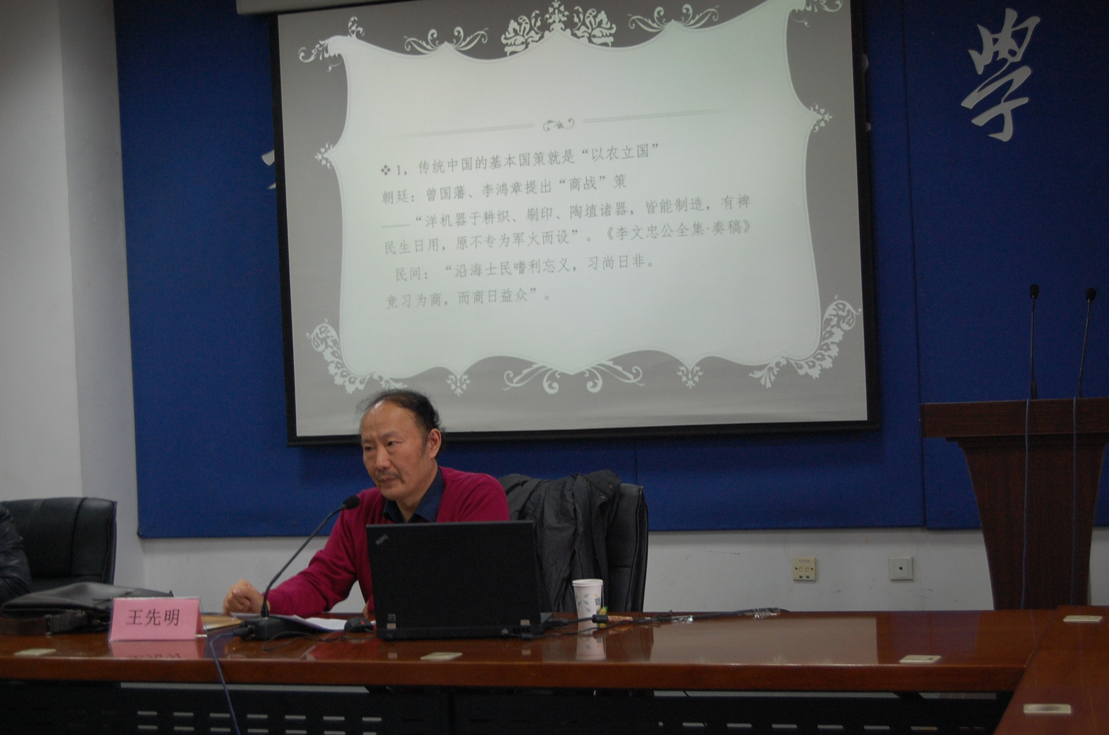 王先生以时代背景为视角,对中国现代化进程中的农业、农民、农村的演化进程进行详细描述,运用大量史料及现实案例,对我国的“三农”问题进行反思。日趋失重的农业历史进程、日益失位的农民地位演进、日渐失范的农村乡村文化是当前我国农村存在的普遍问题,王先生在分析“三农”问题的基础上,提出解决困境必须做到:农业,失重不可失衡;农民,失落不可失位;农村,失范不可失序的观点。王先生丰富的史料解读、对现实的反思以及深刻的人文关怀,使师生们深受启发。
