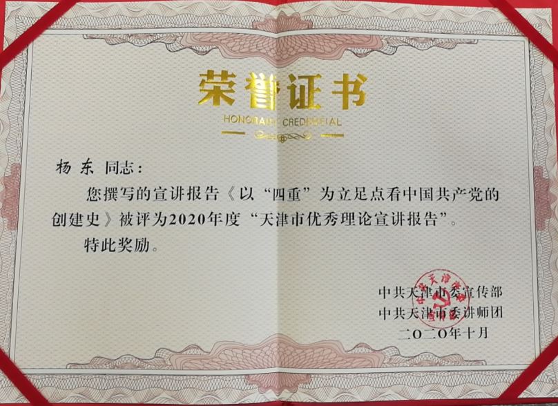 近日,市委宣传部印发《关于表彰基层理论宣讲先进集体、个人和优秀理论宣讲报告、微视频、微信公众号的决定》,对10个基层理论宣讲先进集体、10名基层理论宣讲先进个人、10篇优秀理论宣讲报告、4个优秀理论宣讲微视频和4个优秀微信公众号予以表彰。我校明德讲坛特聘主讲人、伟德bv1946杨东副教授的《以“四重”为立足点看中国共产党的创建史》宣讲报告入选天津市基层理论宣讲优秀理论宣讲报告。