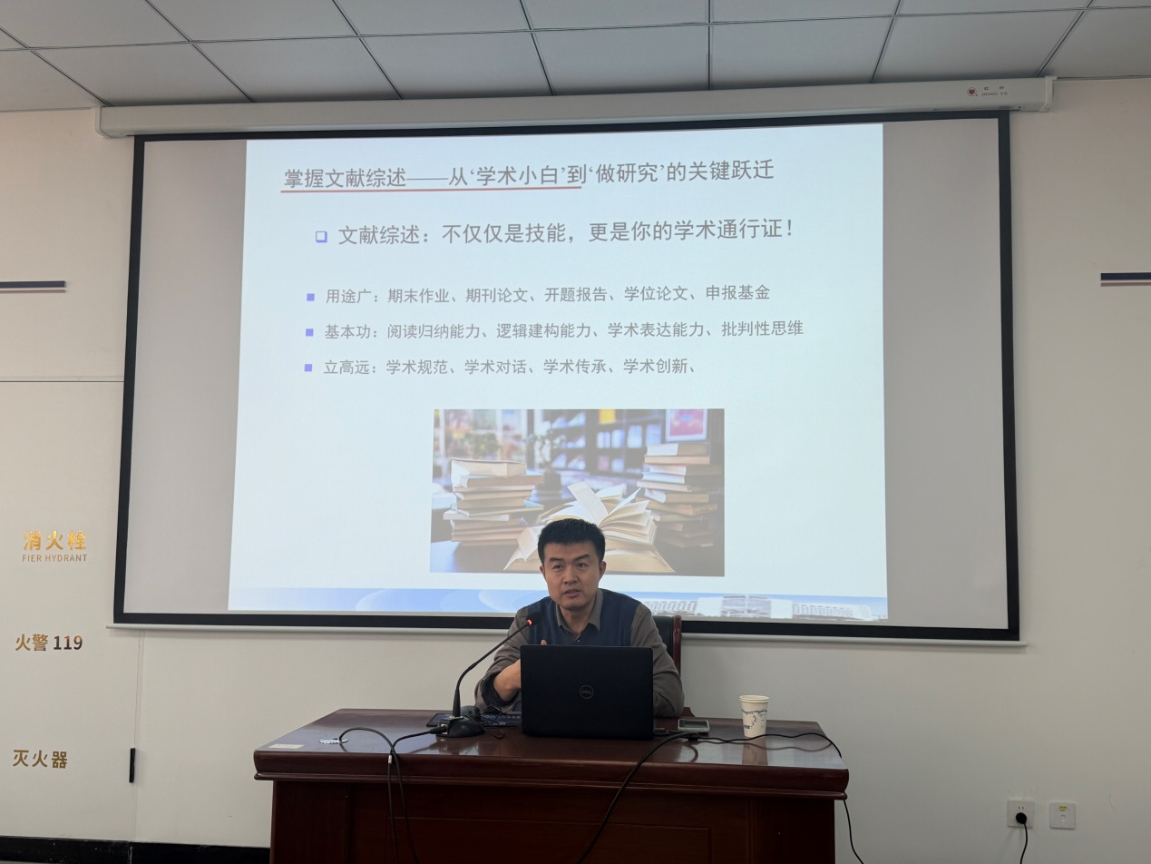 讲座中,闫海潮教授围绕马克思主义理论学科文献综述的核心要点展开系统讲授,从文献综述的概念与目的切入,层层递进地阐释了文献综述在学术研究中的基础性作用。在文献遴选环节,着重强调了经典性、权威性、时效性、前沿性及问题导向与研究相关性原则,详细介绍了主流学术数据库的检索技巧与高效筛选策略;针对文献阅读与整理环节,分享了科学的阅读原则与分类技巧;结合大量学科典型案例,将抽象的撰写要点具象化,清晰阐释了文献综述的类型框架与核心要素,并明确了高质量文献综述的要求与评价标准。